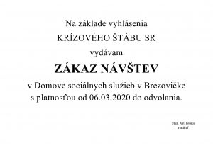 Špecializované zariadenie Brezovička | Zákaz návštev